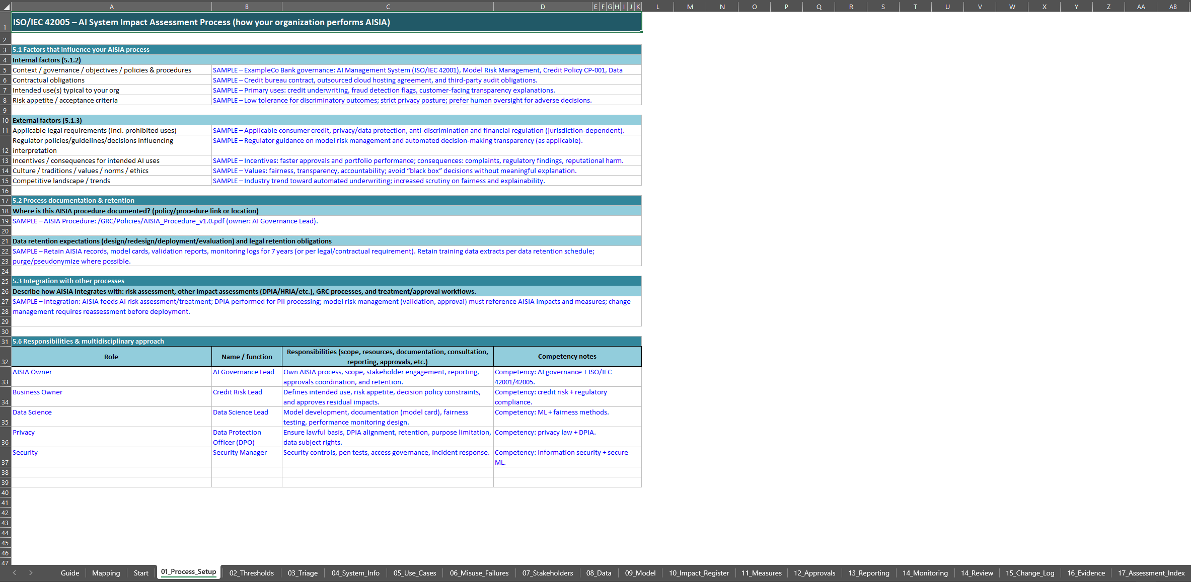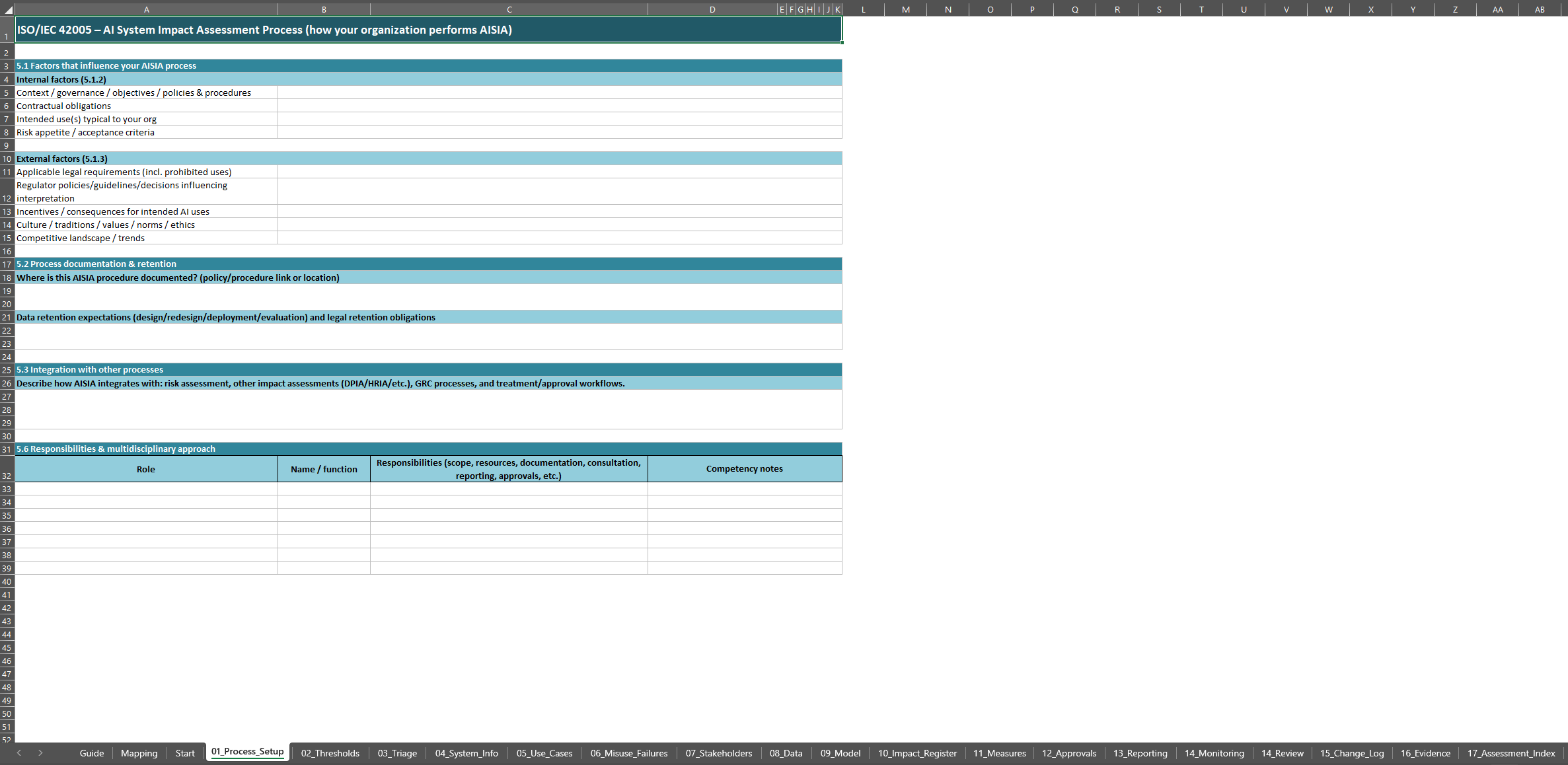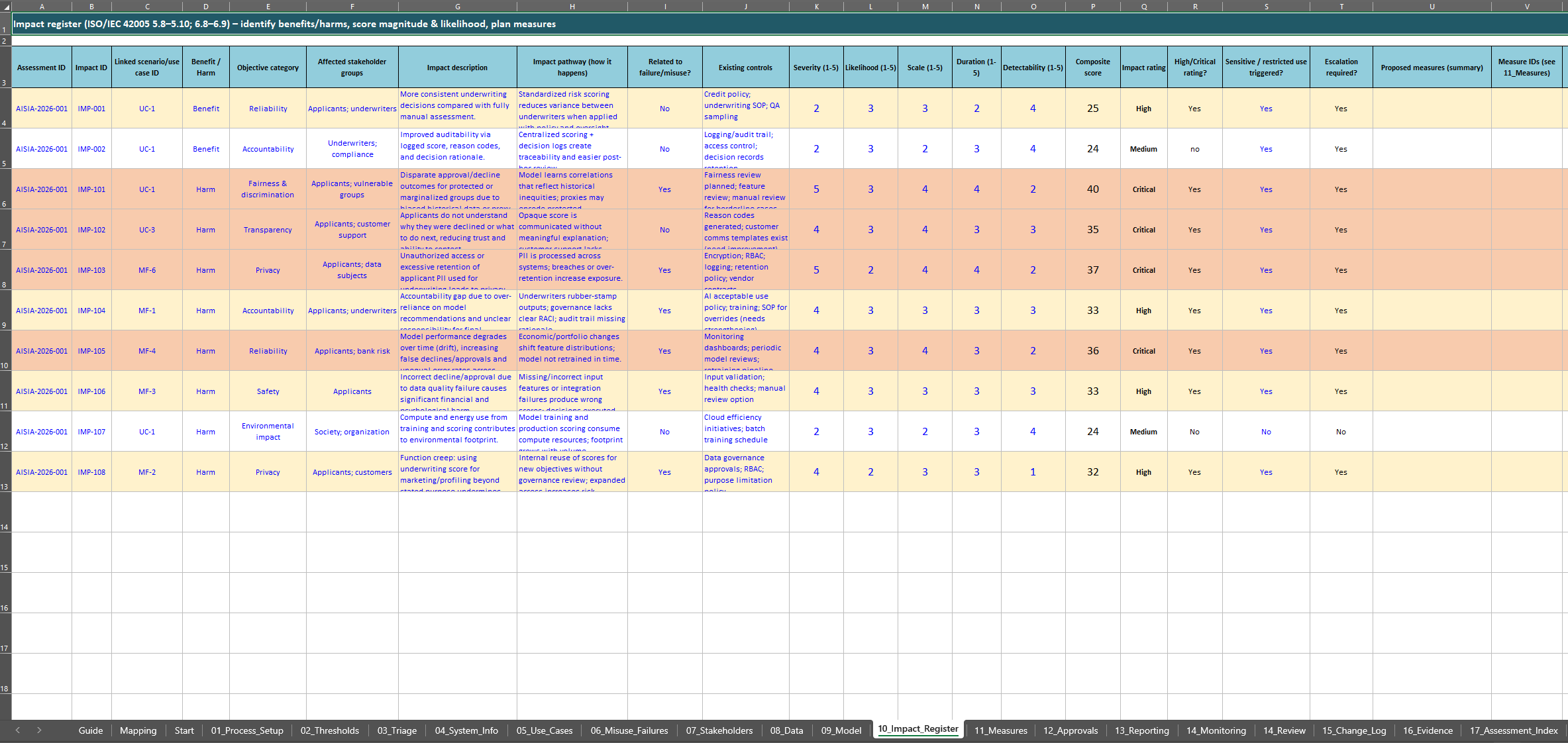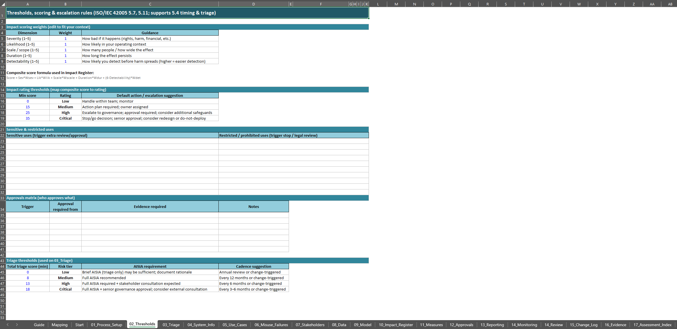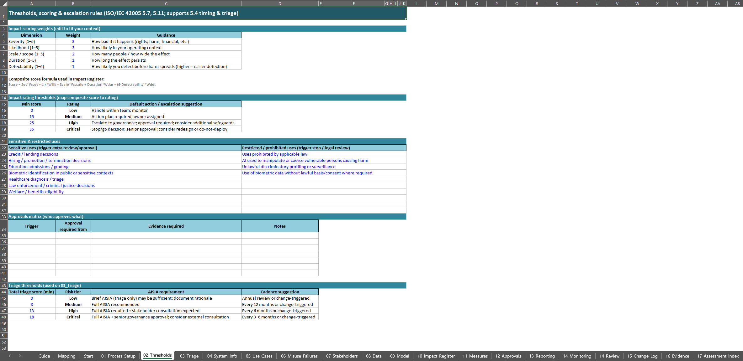 The workbook is structured to cover the full impact assessment lifecycle, from process definition through monitoring and review. It includes sheets for process setup, thresholds, triage, system information, use cases, misuse and failure analysis, stakeholder identification, consultation, data and model information, impact scoring, measures, approvals, reporting, monitoring, review, change management, and evidence logging.