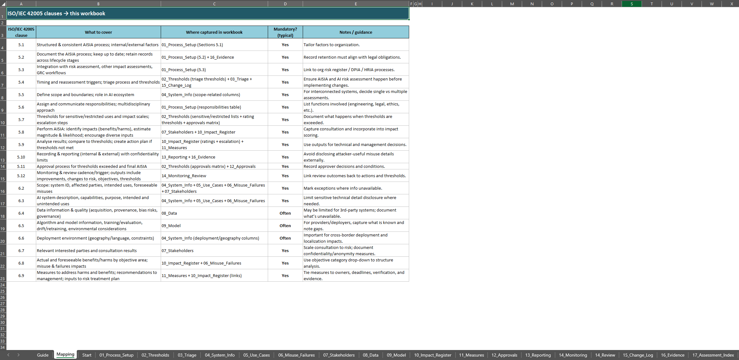 It is detailed enough for serious consulting and governance work, but still practical enough to use in Excel. It can be tailored to a single organization’s context, risk appetite, policies, and approval workflows, while still keeping the underlying structure consistent.