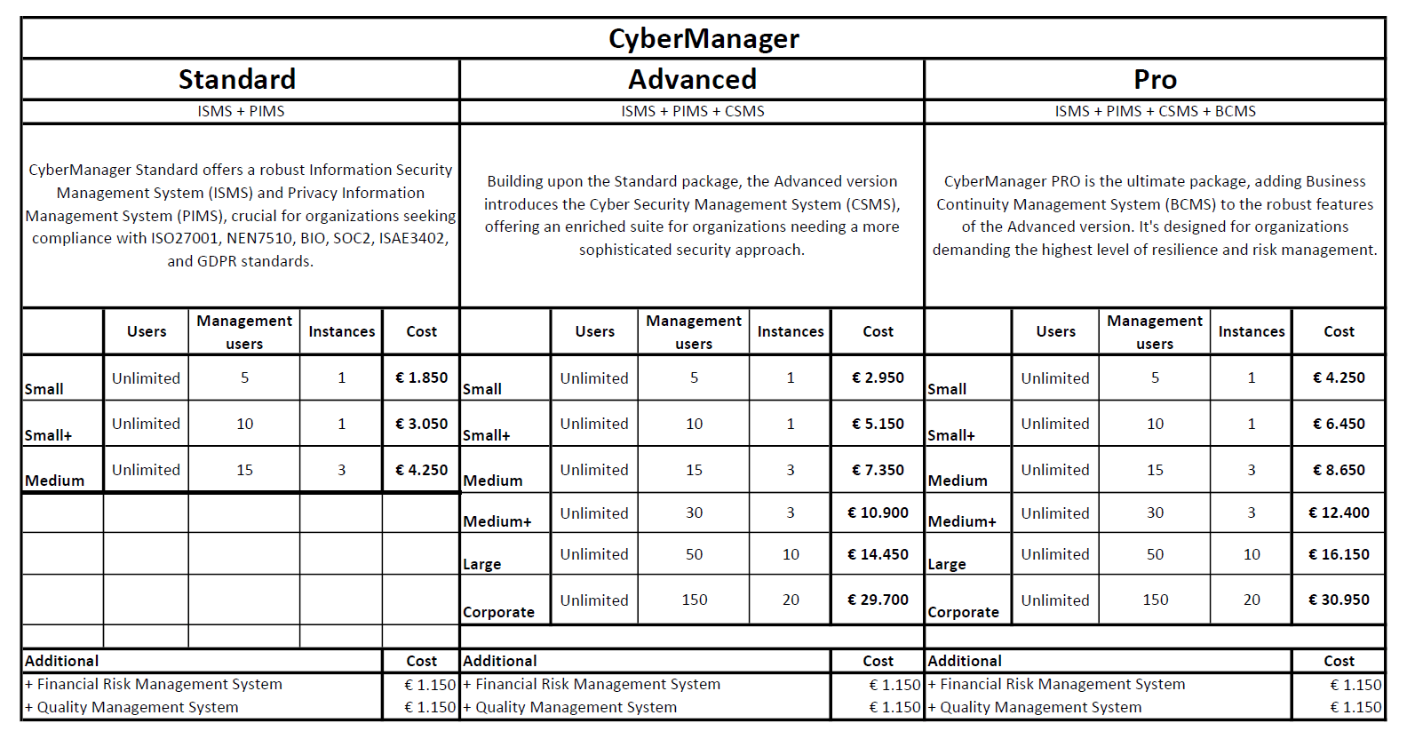 Overview: CyberManager PRO is the ultimate package, adding Business Continuity Management System (BCMS) to the robust features of the Advanced version. It’s designed for organizations demanding the highest level of resilience and risk management.