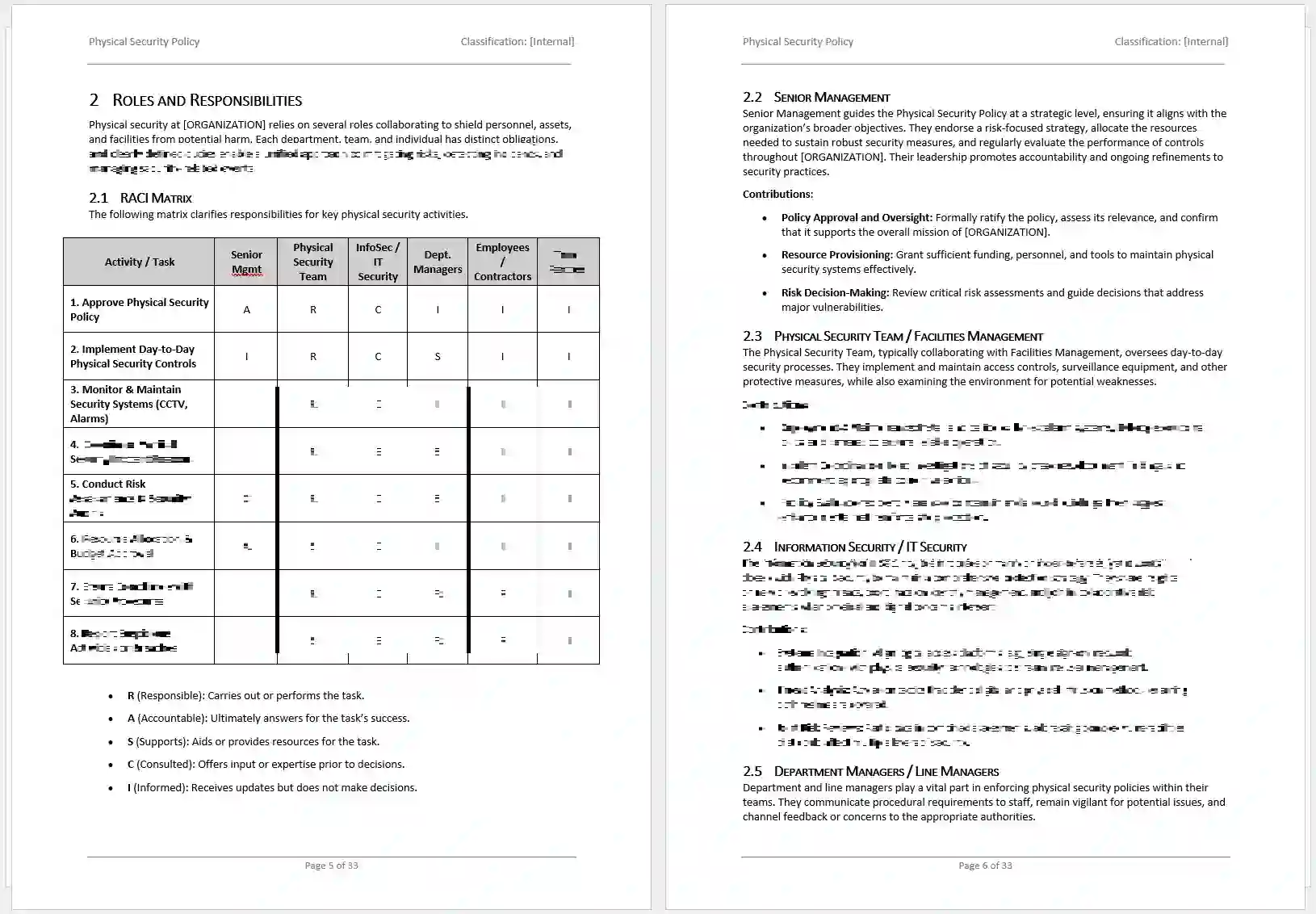 – RASCI Matrix offers straightforward accountability for various stakeholders (e.g., Senior Management, Physical Security Team, IT Security, Department Managers, Employees, etc.).