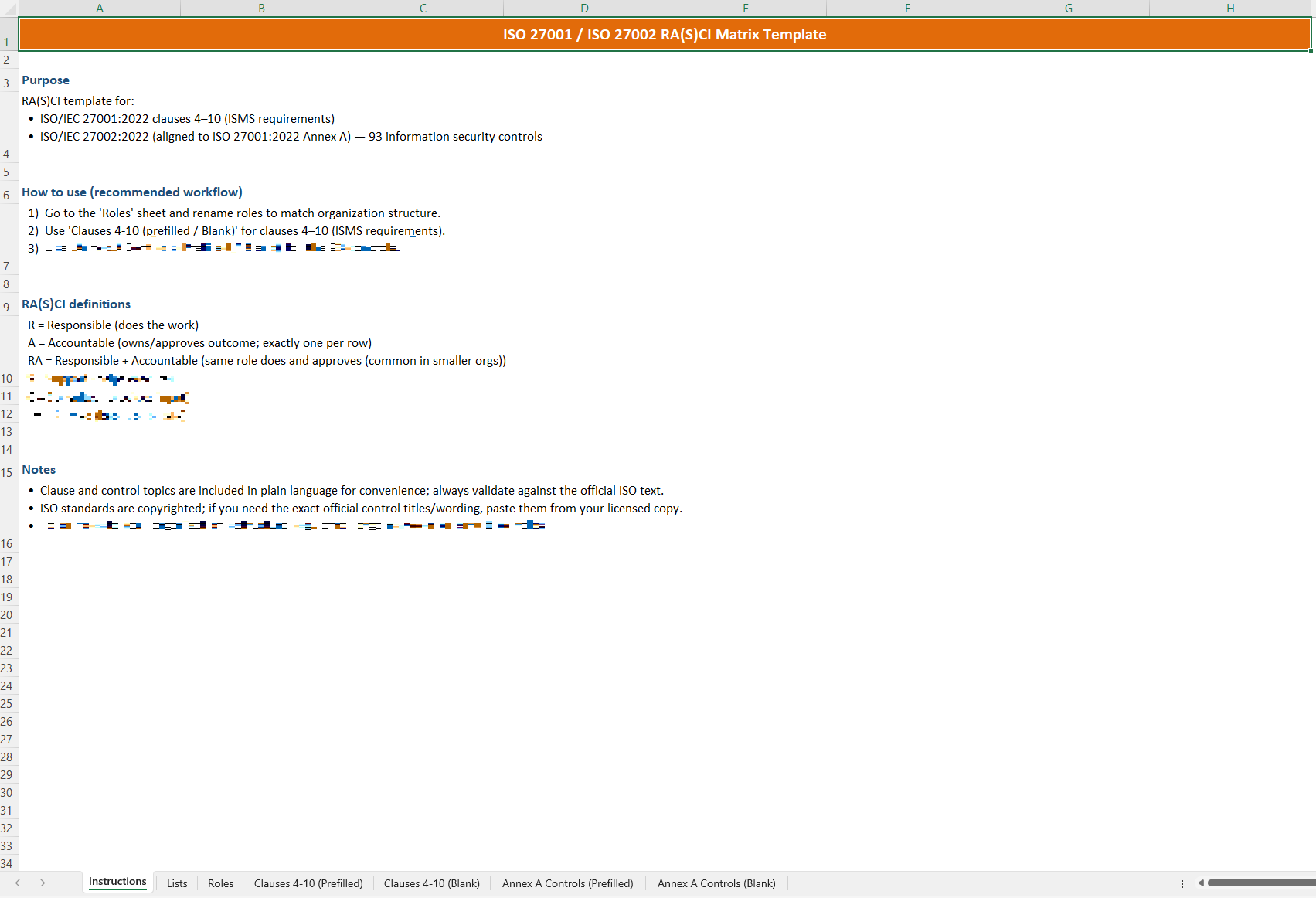 - ISO 27001:2022 Clauses 4–10 (including subclauses) mapped into an easy-to-fill RA(S)CI matrix