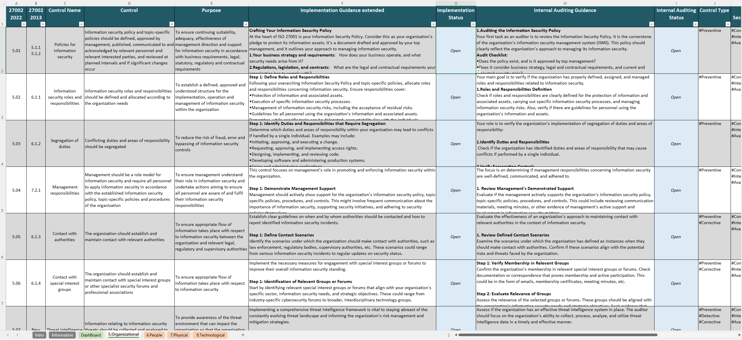 Our ISO 27002 2022 Controls Spreadsheet is a complete solution for Implementing and Managing ISO 27002 controls.