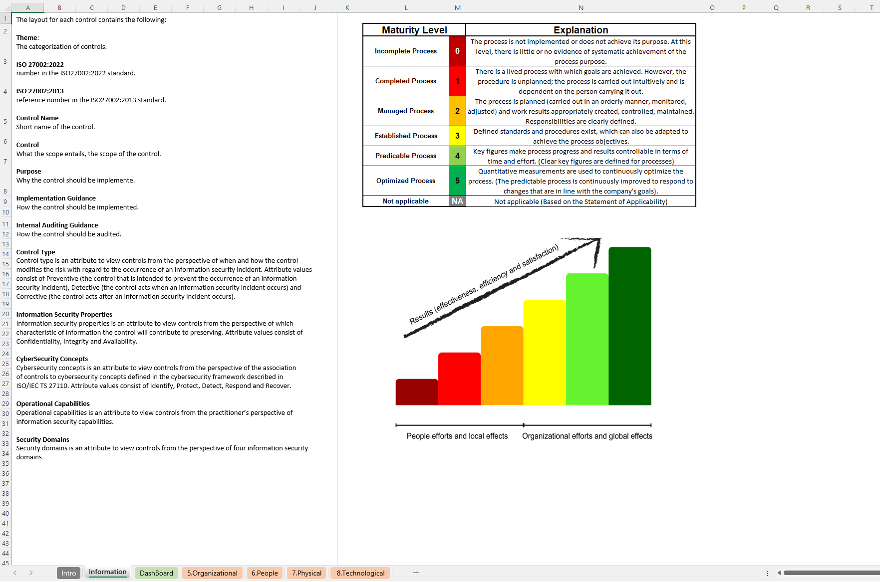 This downloadable Excel file is a controls checklist, an ISO 27002 implementation guide updated to align with the latest ISO 27002:2022 standard version. It combines: