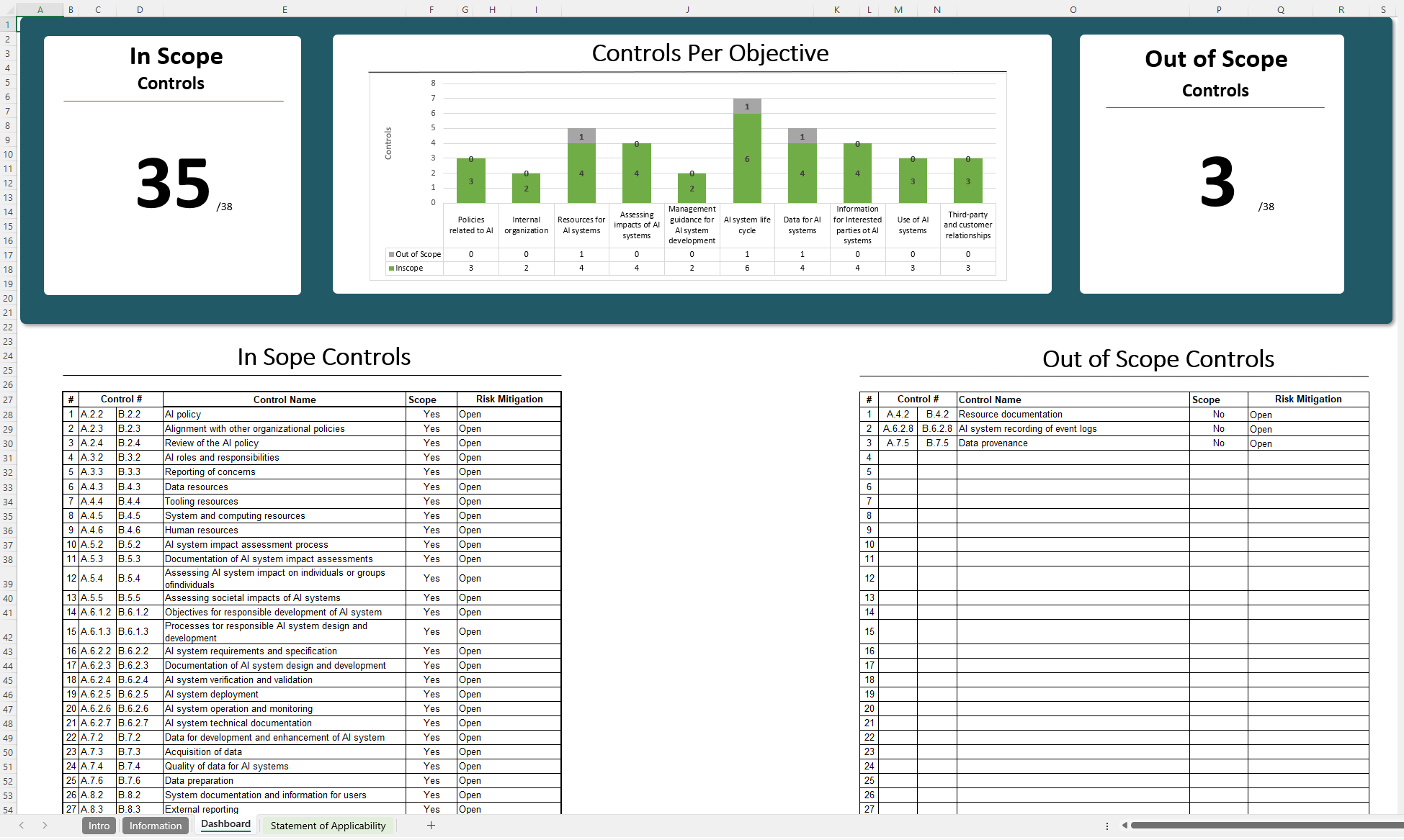 The included dashboard that provides a quick overview of your Statement of Applicability. Instead of sifting through rows of data, get a bird’s-eye view of your entire Scope of the ISO 42001 Controls.