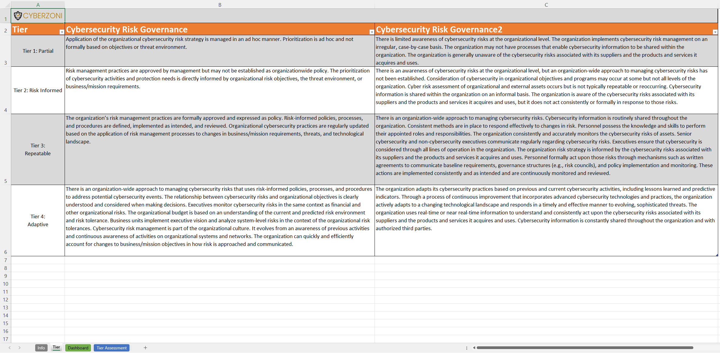 Our NIST CSF Tiers Assessment and Maturity Tool provides a strong, easy-to-navigate framework for evaluating and advancing your organization’s cybersecurity posture. Made for organizations of all sizes, this tool empowers you to conduct a self-assessment, identify critical gaps, and map out a maturity roadmap based on the NIST Cybersecurity Framework (CSF) 2.0.