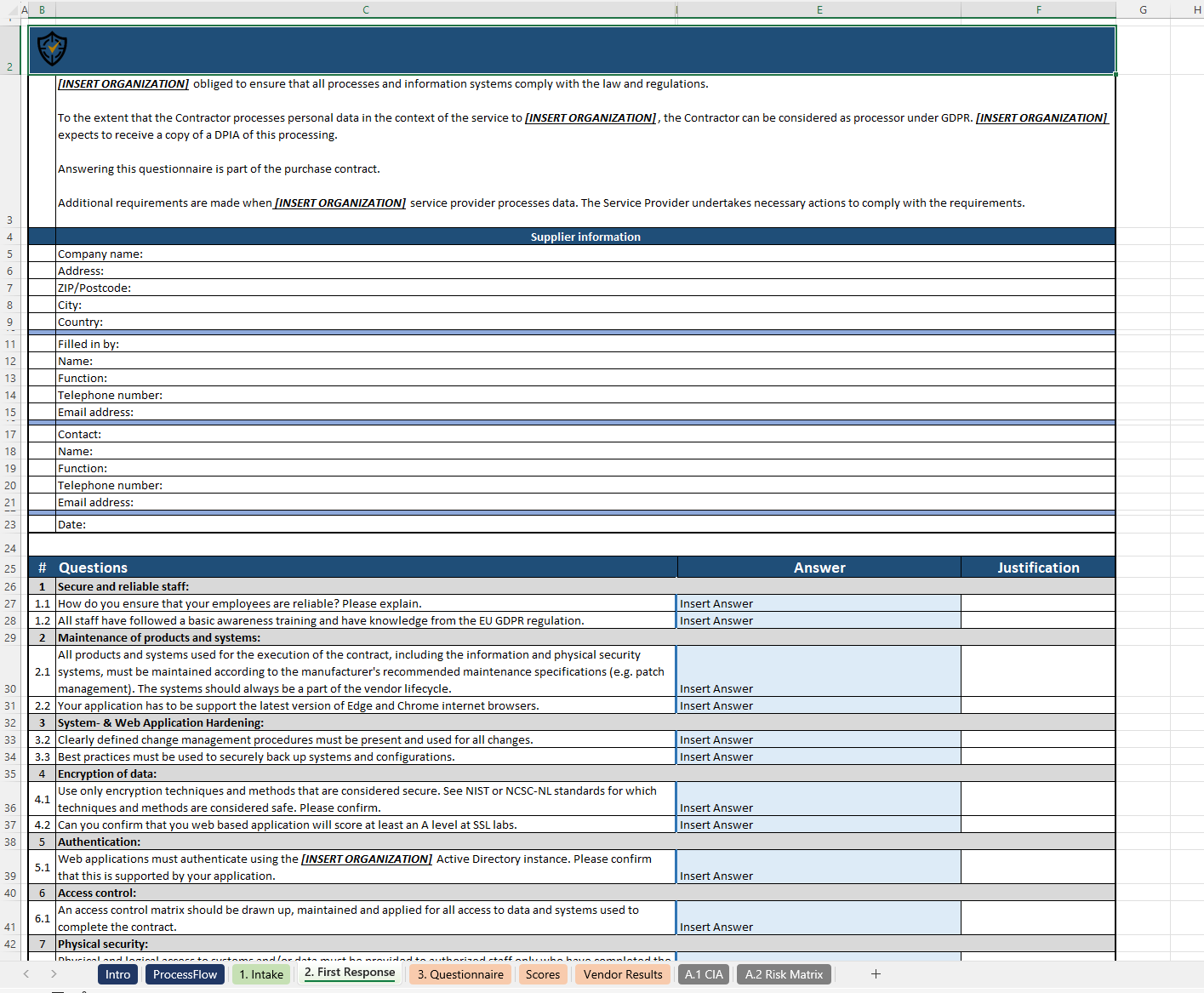 The Vendor Security Questionnaire Template portion of this .xls template makes it simple to gather and evaluate details from suppliers. Sections include: